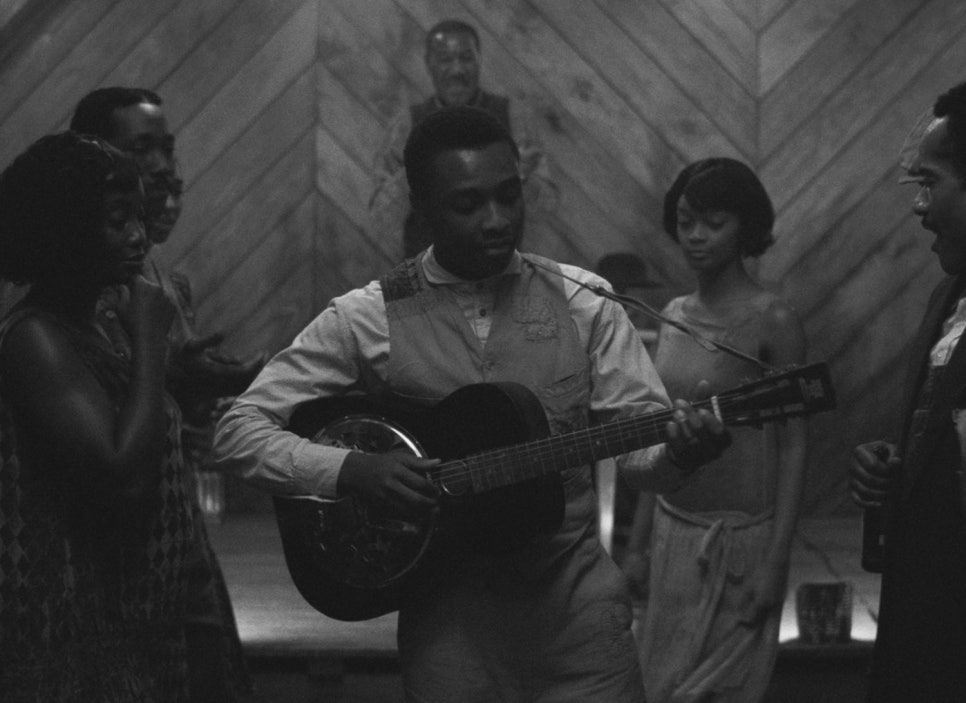 하지만 포스터가 주는 쌈마이한 인상에 속아 넘어가선 안 된다. 이 영화의 심장은 '음악'이다. 루드비그 예란손이 조율한 사운드는 1930년대의 블루스와 현대적인 스코어를 기괴하게 뒤섞으며 청각적 쾌감을 선사한다. 특히 새미가 주크 조인트에서 첫 공연을 펼치는 시퀀스는 압권이다. 그의 기타 선율에 맞춰 과거의 노예들과 미래의 흑인 영혼들이 한데 뒤섞여 춤을 추는 연출은 시각적, 청각적으로 관객의 멱살을 잡고 흔든다. 내가 본 음악 영화, 아니 호러 영화를 통틀어 가장 전율이 돋는 순간이었다. 전개 또한 군더더기 없이 시원시원하다. 서사를 질질 끌며 감정을 강요하는 신파 없이, 핏빛 리듬을 타고 결말까지 쾌속 질주한다.